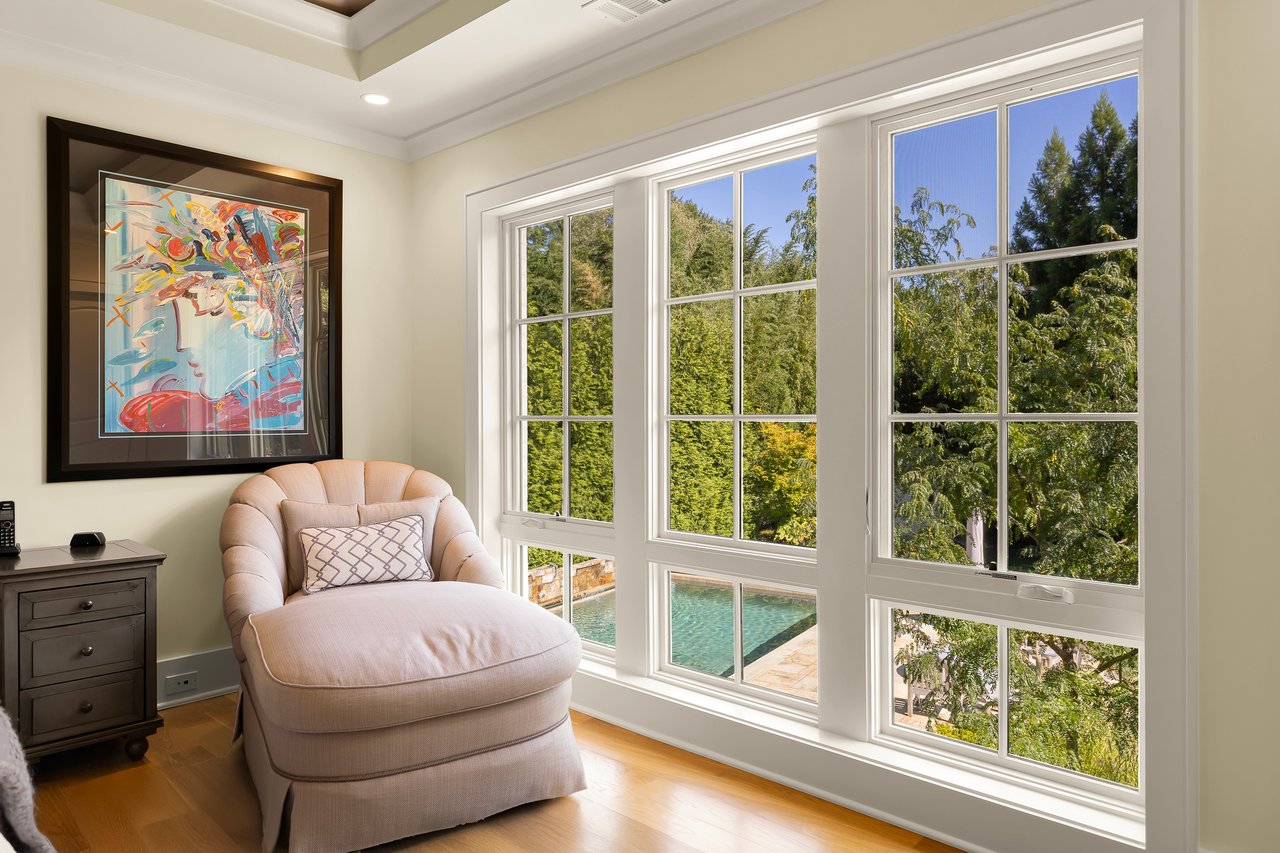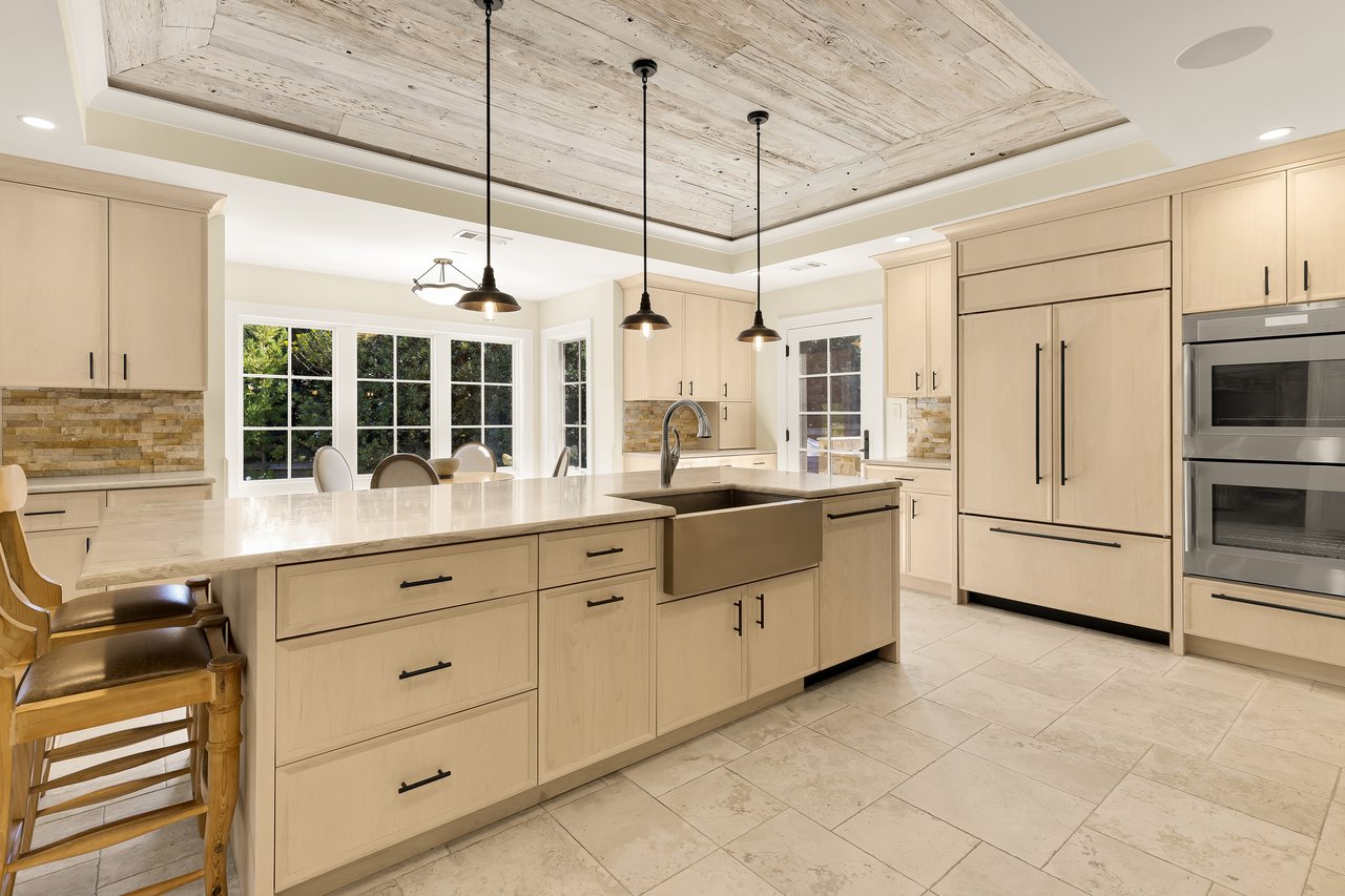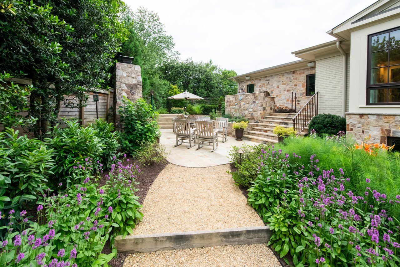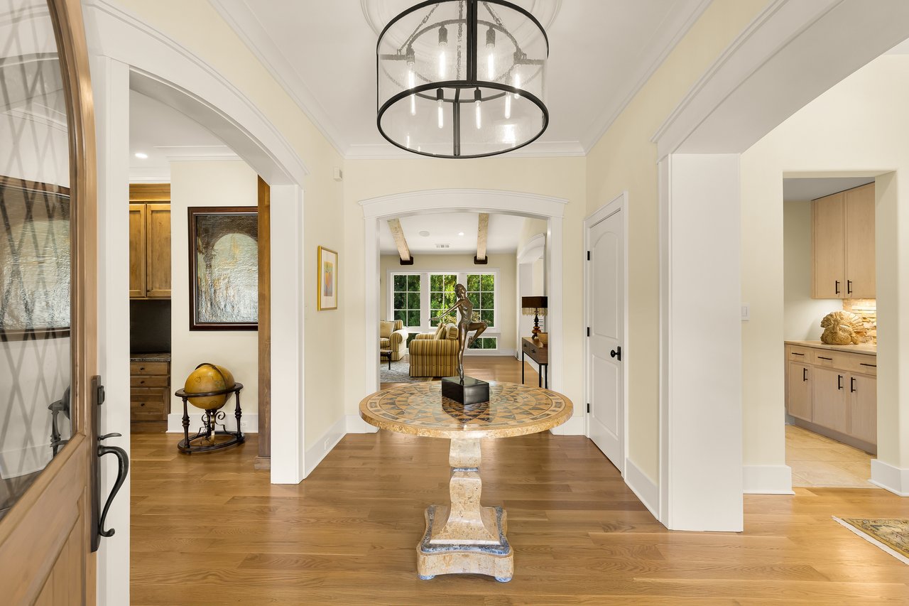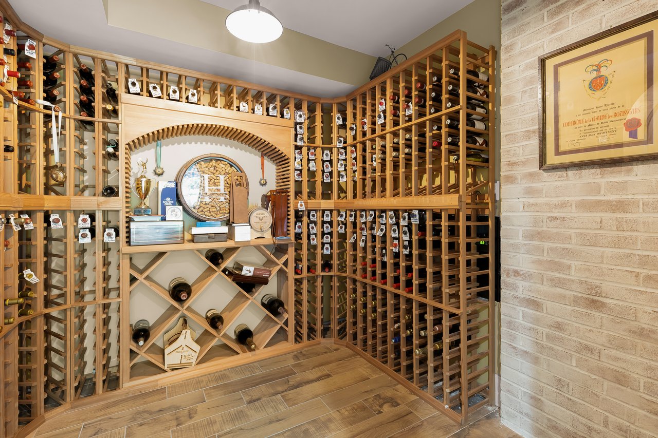 modern French country aesthetic. Prominently positioned, the home’s welcoming curb appeal showcases large arched Jeld-Wen casement windows set into its light brick and stone facade. A wide driveway approaches the attached two-car garage, a significant addition which includes thoughtful built-ins and an aluminum gate to the rear lawn, easing the transition between indoor and outdoor. Beneath the covered front patio, natural stone, reclaimed wood, and custom steel brackets are complemented by cozy gas lanterns from Valley Forge. The entry foyer serves as a dignified introduction to the open floor plan, showcasing an RH chandelier and 5-inch quarter sawn hardwood floors throughout main level. Flanking the foyer are a private office with custom built-ins and a banquet-sized dining room featuring a stacked stone feature wall and RH chandelier. A striking cathedral ceiling with exposed, reclaimed wooden beams spans above the main living room, augmented by a roaring floor-to-ceiling stone wood-burning fireplace. The theme is mirrored in the chef’s kitchen, also featuring a reclaimed wooden ceiling, custom birch cabinetry, and bone natural limestone flooring. Custom finishes abound, such as the inset cooktop, imported Italian leathered marble countertops, hammered brass apron sink, and a complete suite of Thermador and SubZero appliances. An adjacent breakfast area is flooded with natural light and offers direct outdoor access. An elaborate mudroom and laundry room area accesses the garage. In the bedroom wing, the sumptuous primary suite features a custom tray ceiling, large dressing room with custom built-ins, and RH fixtures throughout. The primary bath features a dual vanity, clawfoot tub, walk-in shower, and travertine flooring. A second bedroom nearby has an adjacent, tiled full bath. At the bottom of the custom iron staircase is the lower level’s recreation room. Walking out to the rear lawn, natural light floods the space, illuminating the stacked stone fireplace with reclaimed wooden mantle. A stone archway frames the custom keypad-protected wooden door to the 800-bottle temperature controlled wine cellar. Three additional bedrooms are generously proportioned and luxuriously equipped with amenities such as French door closets and motorized blinds. One has an ensuite bath and the other two share an adjacent hall bath. An ample storage room with built-in shelving completes the lower level. A splendid rear patio fills the large, level 0.42 acre lot and includes an integrated grill, pizza oven, and firepit for the ultimate al fresco lounging. Stairs descend to a sunken lounge area and the heated saltwater pool with automatic cover and remote-controlled fountains. Mature landscaping surrounds the fully fenced in yard for total privacy. A complete smart home suite controls various functions including Lutron lighting, Sonos indoor/outdoor surround sound, security cameras, and an energy-efficient HVAC system. A whole home Generac generator offers peace of mind. With an unparalleled location close to parks, trails, and Downtown Bethesda’s shopping, dining, and entertainment, Burling Road represents luxury living to the highest degree.